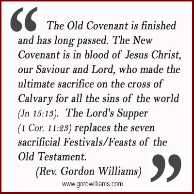 The practice of "Old Testament" festivals/feasts denies the completed work of Jesus Christ, and has become a growing problem in our churches today that no longer can be tolerated. When Jesus spoke his last words, "It was finished," just before He died on the Cross of Calvary (Jn. 19:30), He told us that the "Old Covenant" was complete, and no longer in effect (Heb. 8:13), and that He paid for the sin of the world (Is. 53:7; Matt. 26:28). "This is my blood of the covenant, which is poured out for many for the forgiveness of sins." (Matt 26:28) The New Covenant replaces the Old Covenant.